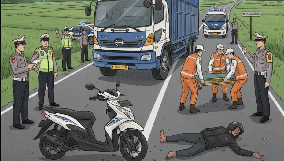 Dilokasi kejadian sepeda motor yang dibawa Endi oleng dan menghantam samping belakang kanan Truk Hino Nomor Polisi B 9843 FYU yang dikemudikan oleh Cecep Royadi yang datang dari berlawanan arah.
